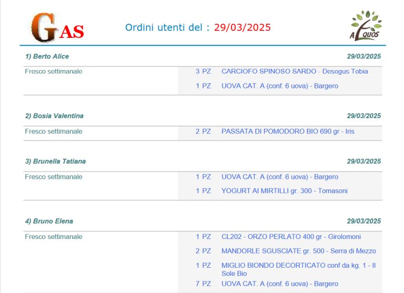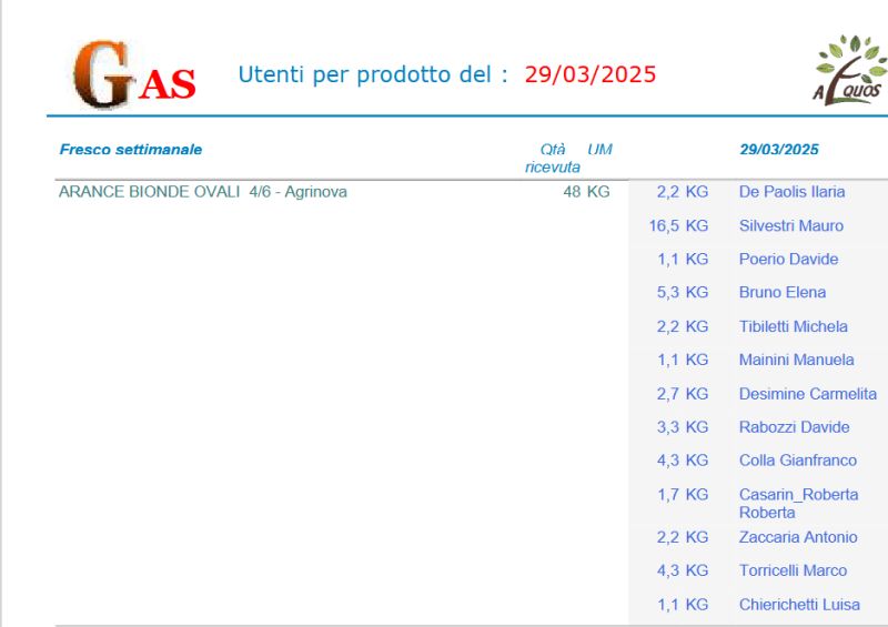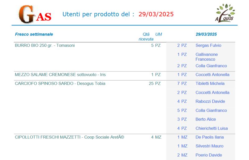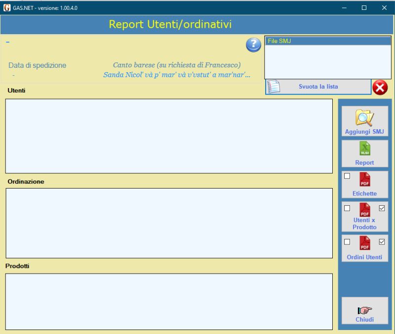 Buongiorno a voi tutti, nella riunione https://gas-sestocalende.it/minute/minuta_gennaio_2025.pdf emerse che : A nome dei responsabili della gestione degli ordini Aequos, Torricelli condivide la difficoltà che si è venuta a creare nella stampa delle liste degli extra (prodotti consegnati tramite Aequos, ma non catalogati come frutta e verdura). Non è piu'possibile infatti utilizzare il software creato da un ex socio, che ha lasciato il GAS e non si rende piu' disponibile ad offrire il suo supporto tecnico. Contattato da De Paolis, ha consigliato di tornare al vecchio metodo, cioè tramite stampa dal foglio excel manualmente filtrato. Ciro Desimine mette a disposizione la propria competenza specifica e si impegna ad approfondire il tema e trovare una soluzione. A seguito di questo, Ciro e Francesco hanno collaborato per mettere a disposizione un programma alternativo e funzionale che faranno dimenticare l'applicativo precedente. Francesco ha consegnato a Ciro tutte le specifiche per il programma e Ciro ha implementato una favolosa procedura che sostituisce alla grande il vecchio programma. I test numerosi sono stati effettuati da Francesco, errori sono stati risolti da Ciro, ed ora possiamo dire che tale procedura la si puo' renderla ufficiale. Questa procedura puo' essere utilizzata da chiunque la desideri averla sul proprio PC senza nessuna variazione dei propri programmi installati. Alla fine della installazione (documento di Ciro), e alla attivazione del programma sul proprio PC, vi sarà presentata una schermata come qui sotto. Il programma di installazione e il documennto per l'utente finale sono presenti alla presente pagina , la Guida dettagliata all’utilizzo di GAS.NET è presente nella stessa cartella dove sono i vari reports Questo applicativo sarà utilizzato principalmente dagli attuali tre referenti incaricati della preparazione dei file Aequos per la distribuzione del sabato. I report elaborati verranno inviati entro il giovedi' al gruppo di smistatori tramite e-mail con oggetto 'Note smistamento'. A quel punto, gli smistatori potranno scegliere come utilizzare i report, decidendo se stamparli o scaricarli sul proprio PC per consultarli il sabato. La schermata ci permette di selezionare e ottenere diversi report, prima sarà necessario aggiungere uno o piu' files SMJ usando la funzione "Aggiungi SMJ", nel caso si aggiungesse un file di troppo o sbagliato, basta selezionare il file SMJ e usare usare il tasto con "X bianca su sfondo rosso" e il file sarà eliminato dal processo. Nulla vieta di processare un file SMJ alla volta o tanti file SMJ insieme. Una volta aggiunti i files SMJ abbiamo diverse possibilità di reportistica. Si accettano commenti positivi e propositivi, non si accettano critiche, saranno ben accette invece proposte costruttive e migliorative, grazie Francesco