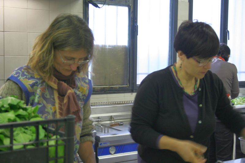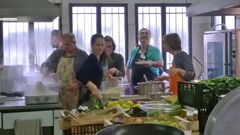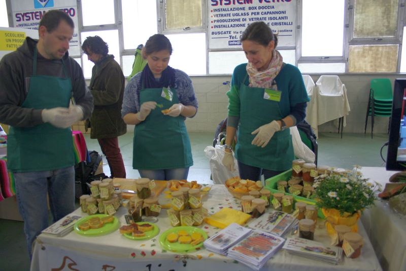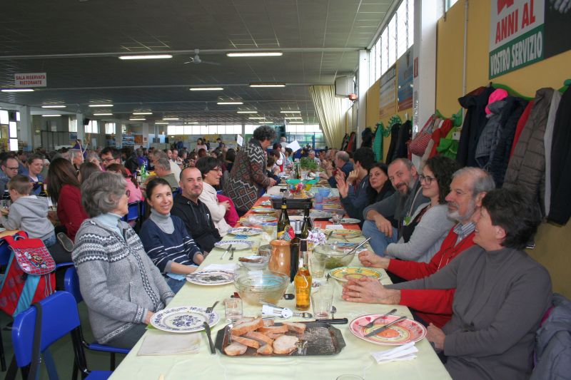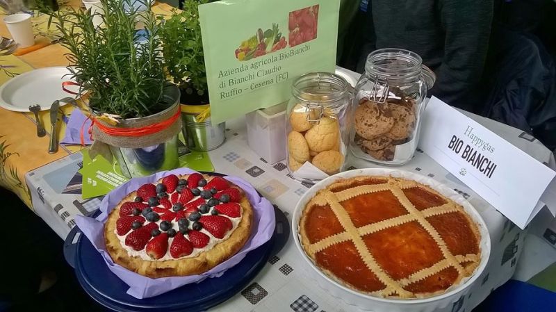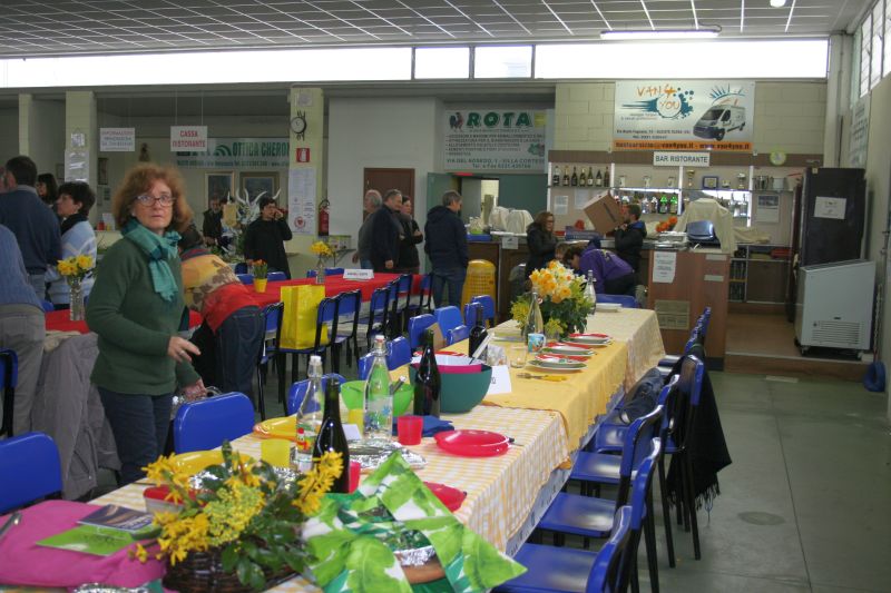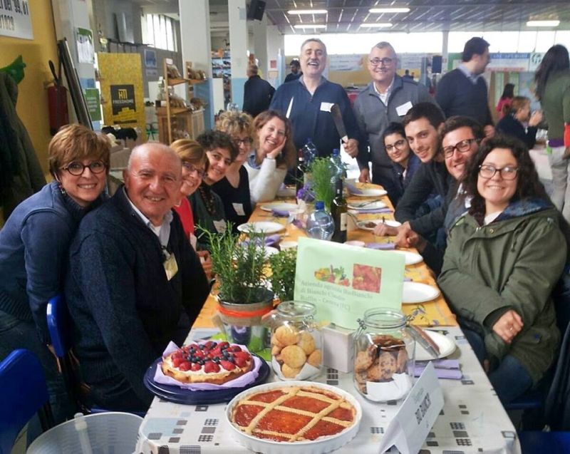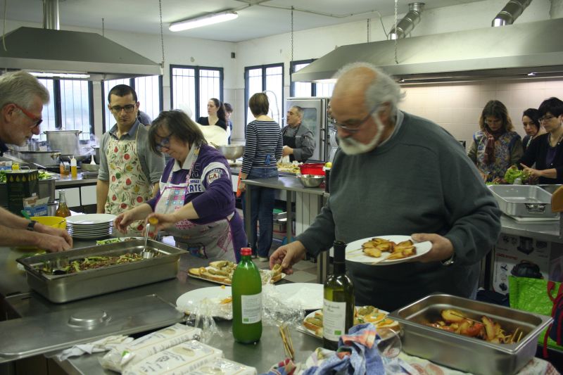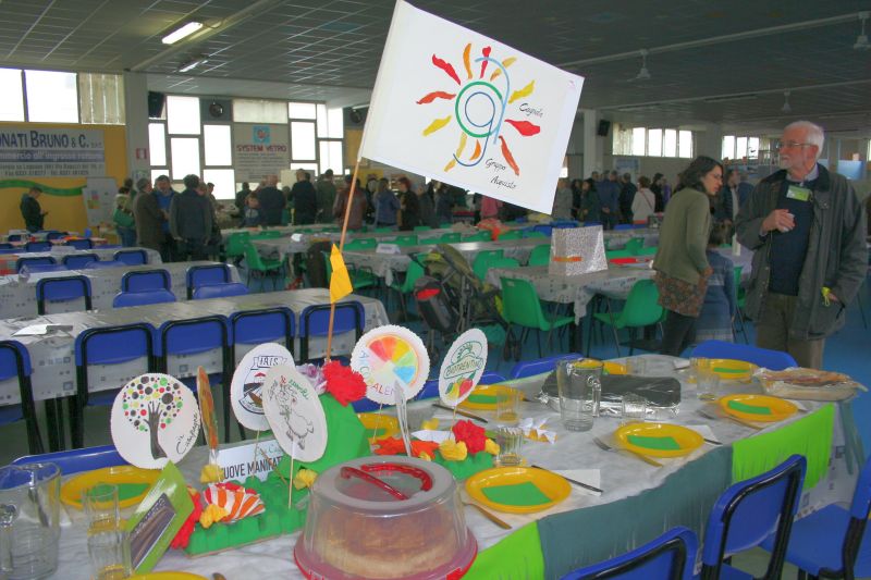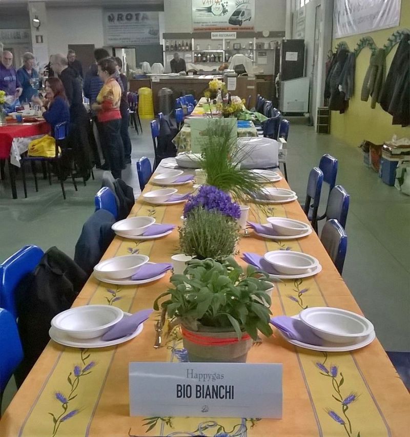 Per la mise en table vasetti zincati e piantine aromatiche, fra le quali un timo dal profumo prepotente e una campanella viola come dipinta. La tovaglia è un prestito della Rita (la mia mamma, ndr), un lontano regalo savonese dai colori primaverili. Giusto il tempo per un giretto fra biscotti e taralli dell'economia carceraria, le creme di verdura e le conserve di frutta con cui presto una cooperativa sociale arricchirà il listino settimanale, caffè e zucchero zapatisti, prodotti in carta e plastica riciclate, tessili bio. Poi il tavolo si riempie; purtroppo l'influenza ci ha privati di una presenza, ma quest'anno è ospite del nostro Happygas il fantastico quartetto Bianchi, che di questi tempi ci delizia con cicorini rossi e verdi che sono una bontà. Papà Claudio, Matteo e Giorgia, eredi di tanta rurale sapienza, che hanno scelto di restare, insieme, a occuparsi delle terre di famiglia, e il di lei moroso, Michael. Fra una torta salata e un risotto al vino si lasciano intervistare, pazienti e appassionati, e rispondono nella meravigliosa parlata romagnola, a ogni nostra curiosità su ettari e prodotti che crescono e ci manderanno nei prossimi mesi, da Cesena; ci raccontano di pozzi e nascenti consorzi per l'acqua, bene prezioso che talvolta scarseggia. Alla fine ci ritroviamo affamati di dolci fragole e succosi meloni e cocomeri. Di ritorno da un'altra tavolata di gasisti ai suoi favolosi calzettoni biologici in alpaca, cotone e canapa, si intrattiene con noi il primo dei nostri commensali, stagione 2016, invitandoci a una gita sul Garda con tappa al calzificio Zambelli. Dopo la consueta scorpacciata di ogni ben di Dio e prodotto dell'Uomo, si riordina e si condividono abbondanti e gustosi avanzi della mega cucina, prima di andare tutti all'atteso incontro coi produttori. Questa volta il tema è serio: il bio, gli enti certificatori, i controlli sul campo e sulla carta. I protagonisti si raccontano, il tempo passa in fretta senza che ci togliamo la voglia di conoscere meglio questi coraggiosi fornitori di bontà, alcuni autentici pionieri, tutti che rivendicano la priorità del bio sulla chimica. Torniamo a casa un po' più consapevoli, progettando spedizioni estive e vacanze solidali, ricordando sorrisi e sognando ortaggi freschi e frutta profumata. Bianchi e Zambelli, tremate: Happy comitiva in arrivo sul primo binario. Angelica