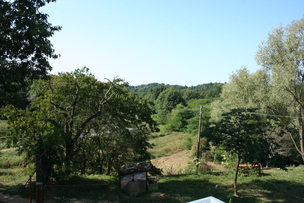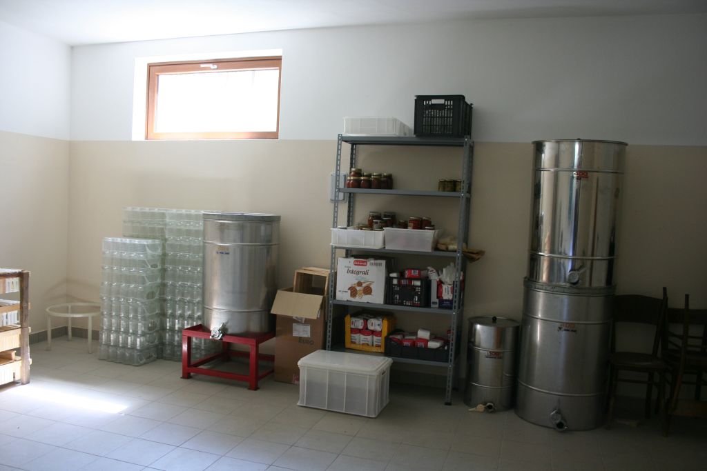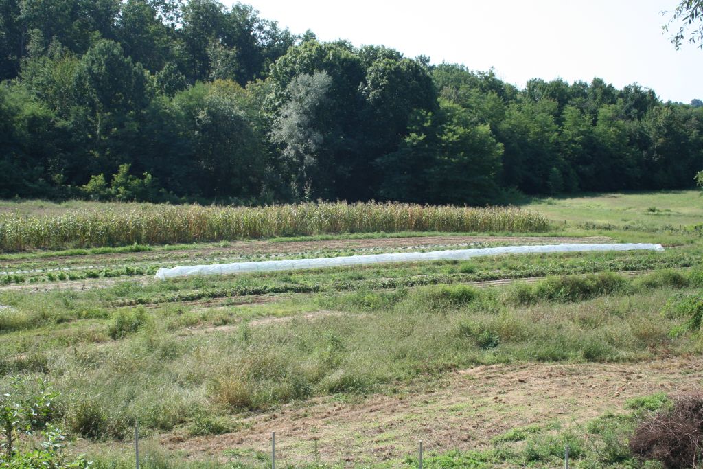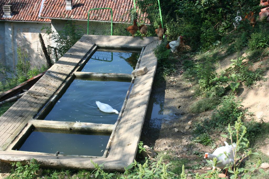 Abbiamo visto il nuovo porticato, le macchine da lavoro, la piscina per le ochette attraverso un meccanismo di pompe preleva l'acqua sorgiva presente nella proprietà. Ci siamo inoltrati nel bosco, dove poi in cima ci aspettava un venticello rinfrescante, e qui c'erano le nuove piantagioni di frutti di bosco vari (mirtilli, lamponi, more, ecc), filari nuovi di alberi da frutto, tra cui ciliegi e gelsi neri. Tutto questo con un impianto di irrigazione automatica creato da Marco utilizzando una cisterna-sacco da 5 mila litri che riempie estraendo l'acqua dalle sorgenti della sua proprietà, meccanismo molto ingegnoso. Questo permette una irrigazione goccia-a-goccia agli innumerevoli alberelli e cespugli piantumati. L'orto aveva filari di patate e ortaggi vari.