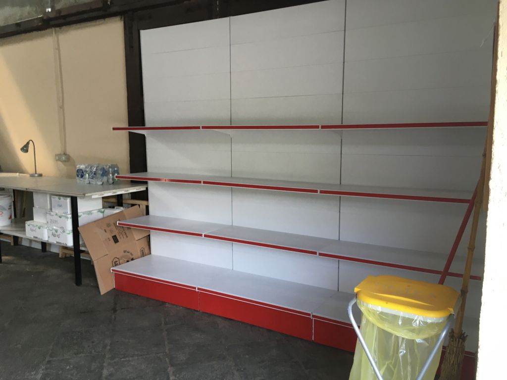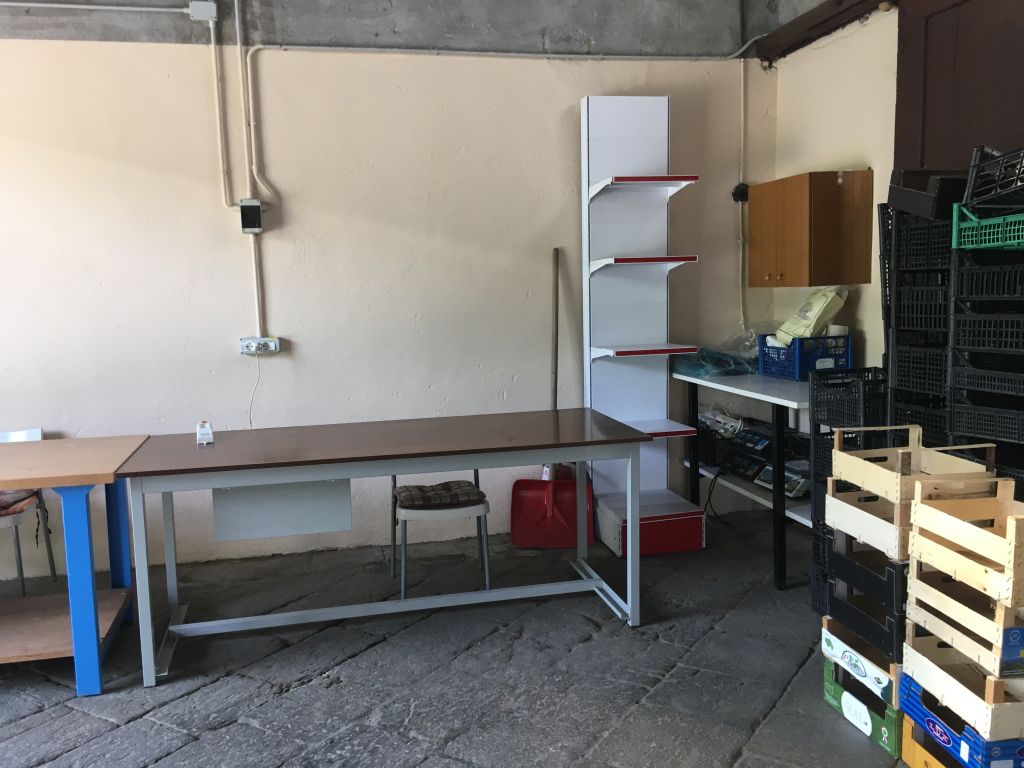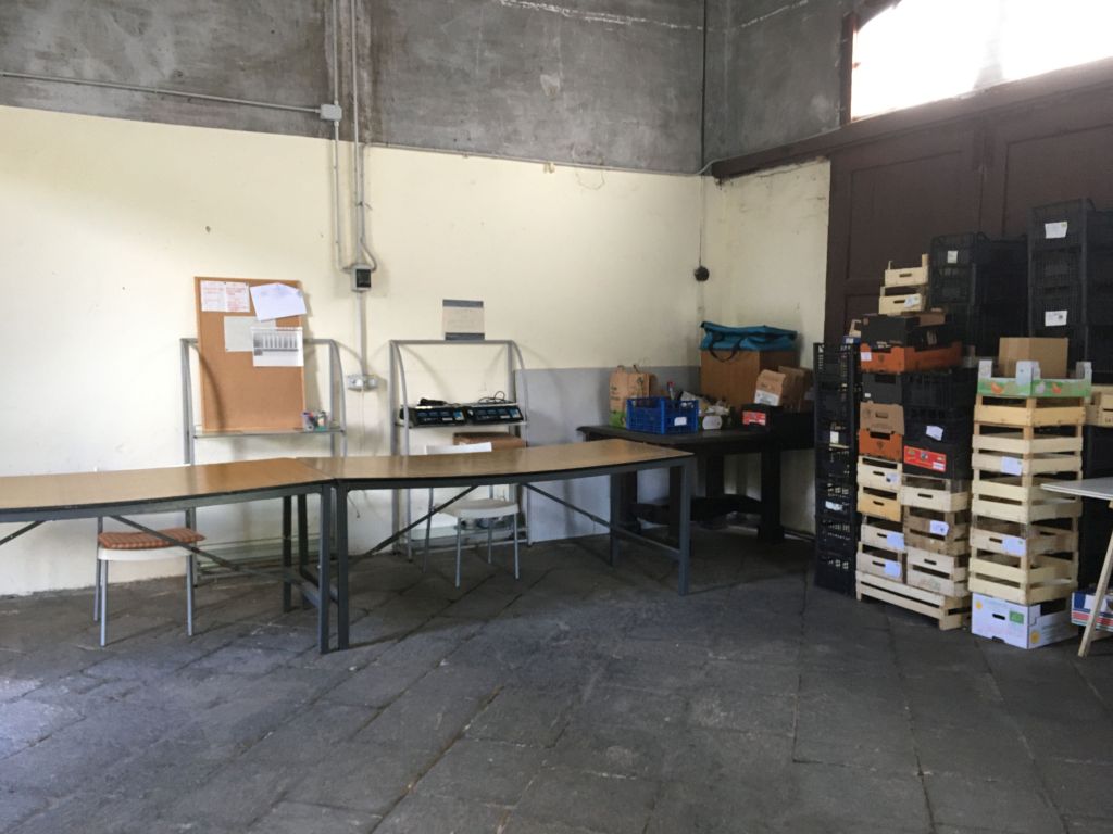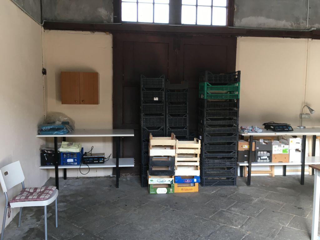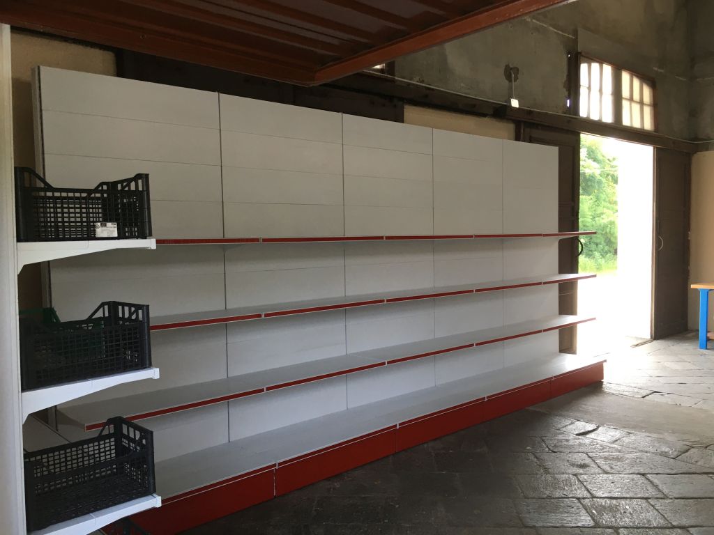 Da un calcolo risulta che su ogni scaffale di un metro con 4 ripiani ci possono essere 12 cassette, abbiamo a sinistra 6 scaffali per un totale di 72 cassette, mentre alla destra abbiamo 3 scaffali per un totale di 36 cassette, in totale poco più di 110 cassette considerando lo scaffale da mezzo metro. Pensiamo che siano sufficienti, non avremo così la necessità di mettere la frutta e la verdura sul pavimento.