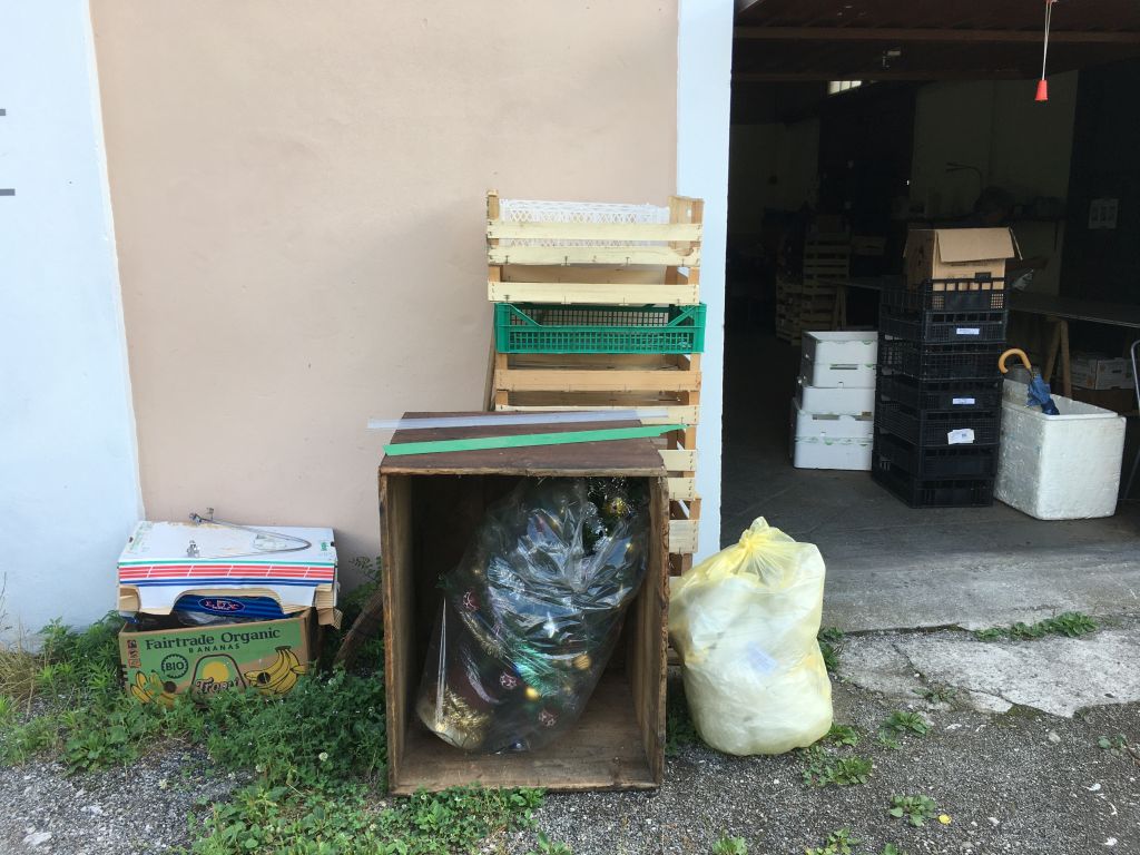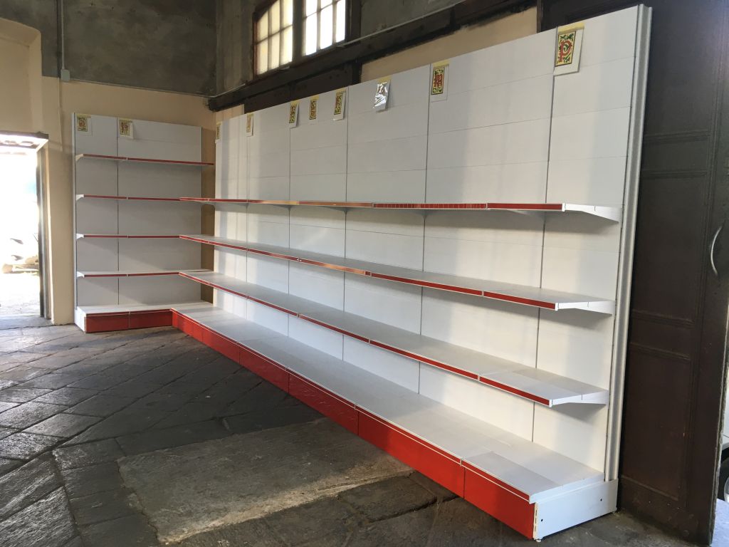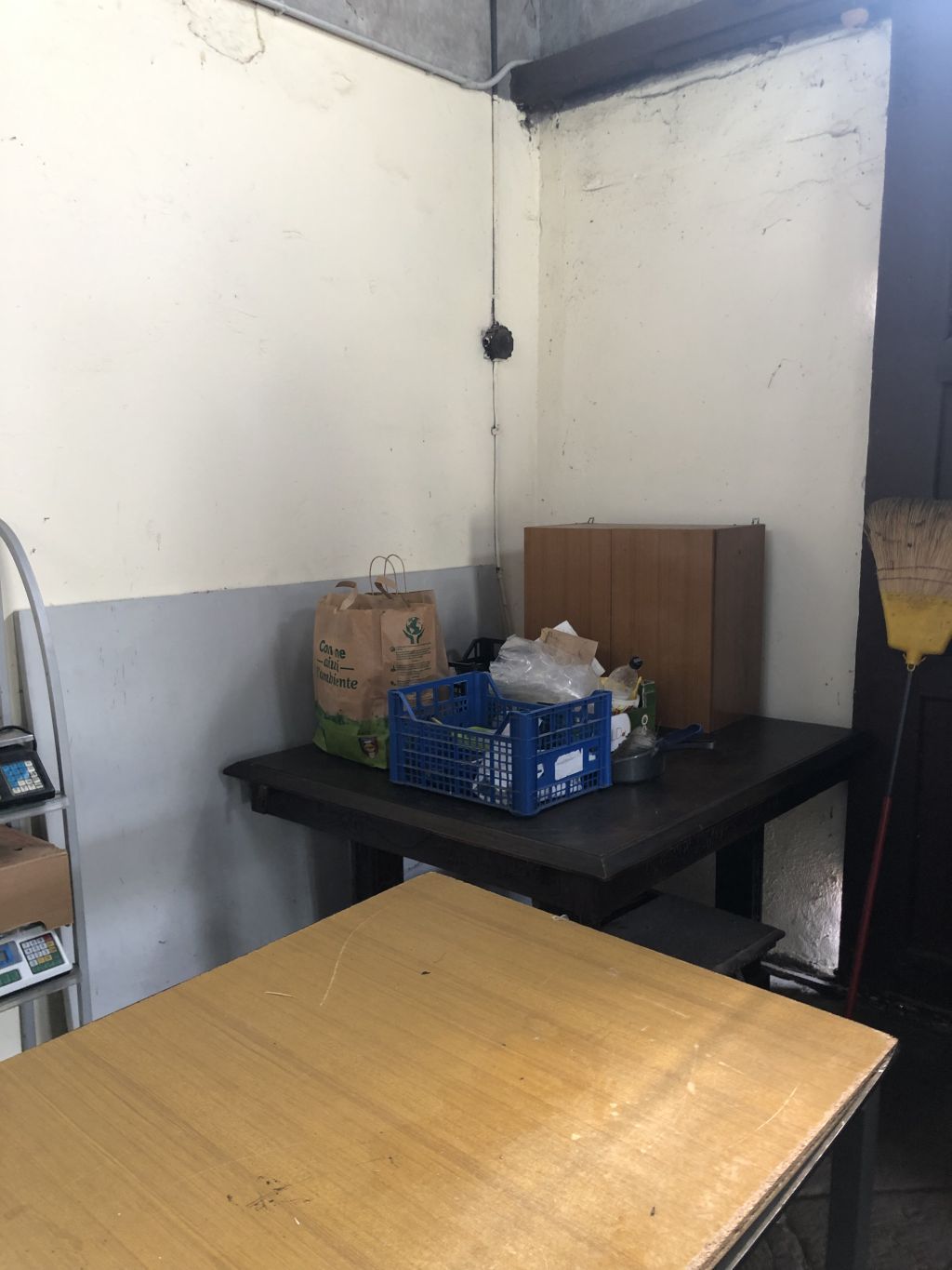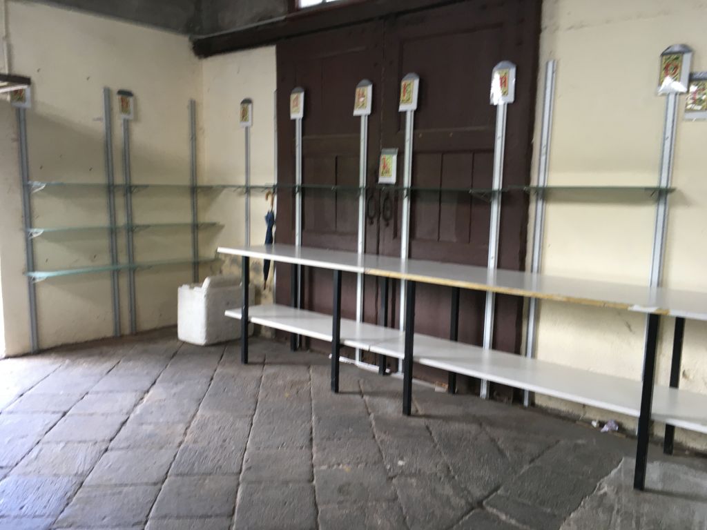 Da un calcolo risulta che su ogni scaffale di un metro con 4 ripiani ci possono essere 12 cassette, abbiamo a sinistra 6 scaffali per un totale di 72 cassette, mentre alla destra abbiamo 3 scaffali per un totale di 36 cassette, in totale poco più di 110 cassette considerando lo scaffale da mezzo metro. Pensiamo che siano sufficienti, non avremo così la necessità di mettere la frutta e la verdura sul pavimento.
